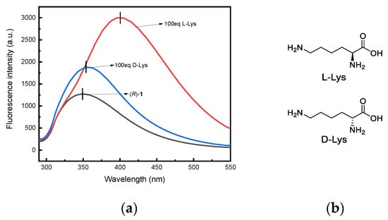 Both (R)-1 and amino acids were prepared in deionized water; the (R)-1 concentration was 2.0 × 10−5 M, and the lysine concentration was 0.1 M (2 mL in volume). Next, 100 eq D/L-lysine was added to (R)-1 to observe the fluorescence response. At λexc = 280 nm, L-Lys’ fluorescence intensity was enhanced, and the wavelength was accompanied by a slight red shift phenomenon, whereas D-Lys’ fluorescence intensity increased only slightly, with almost no change in the wavelength. This indicated that (R)-1’s fluorescence responses to the two configurations of lysine are different and can be differentiated to some extent (Figure 2).