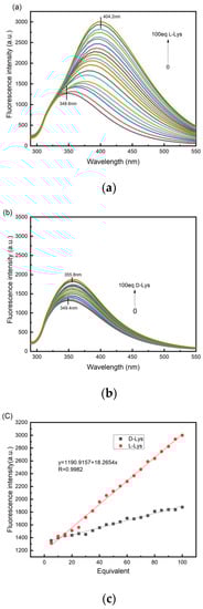 (R)-1’s stability in an aqueous solution was tested; at λexc = 280 nm, (R)-1’s fluorescence intensity increased within 30 min, but its wavelength did not change (Figure S1). Therefore, the small increase in D-Lys’ fluorescence intensity may have been influenced by (R)-1. In terms of fluorescence intensity, (R)-1’ recognition effect for Lys was not obvious; however, with an equivalent increase in Lys, a change in the wavelength between the two Lys configurations showed that (R)-1 can achieve a good recognition effect for L-lysine.