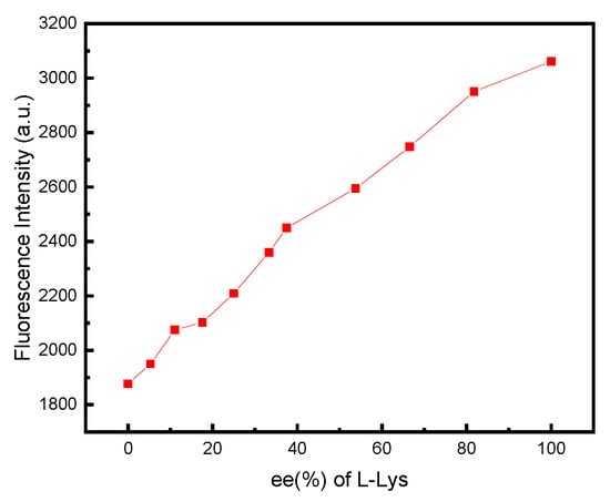 To investigate lysine’s enantiomer composition, the fluorescence response of (R)-1 and lysine at different ee values (ee% = [L] − [D]/[L] + [D]) was explored at λexc = 280 nm; its fluorescence intensity changed when lysine was mixed with (R)-1 at different ee values. Lysine’s enantiomer composition is presented in Figure 4.