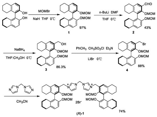 Under argon, NaH (1.63 g, 67.94 mmol) was added to a round bottom flask, and 8 mL anhydrous tetrahydrofuran was added to dissolve the NaH and cool the system to 0 °C. Next, (R)-H8-BINOL (5.0 g, 16.98 mmol) was dissolved by slowly adding ultra-dry THF and stirring for 10 min; then, bromomethyl methyl ether (3.2 mL, 39.06 mmol) was added, and the mixture was continuously stirred during the reaction at 0 °C for 8 h under an argon atmosphere. When TLC detection showed that the reaction was complete, the mixture was quenched with ice water and extracted with ethyl acetate three times. The organic phase was washed with saturated NaCl solution and then dried for 30 min using anhydrous MgSO4. The solvent was removed and purified by column chromatography on silica gel eluted with petroleum ether/ethyl acetate (35:1); a sticky dark-green solid product (6.35 g) with a 97% yield was obtained. 1H NMR (400 MHz, Chloroform-d) δ 7.13–6.89 (m, 2H), 5.14–4.83 (m, 2H), 3.28 (s, 3H), 2.77 (s, 2H), 2.20 (d, J = 61.7 Hz, 2H), 1.69 (d, J = 33.5 Hz, 4H). 13C NMR (101 MHz, Chloroform-d) δ 152.38, 136.92, 131.07, 128.92, 127.29, 112.95, 94.99, 29.57, 27.41, 23.36, 23.25, 23.25.