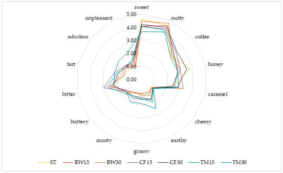On the basis of a detailed analysis, the most frequently declared features of smell, taste, and texture were selected. Odor analysis showed that popcorn, coffee, and almond were the most frequently identified odors among all samples (Figure 1). However, it was the latter that was felt most strongly. Similar results were obtained for the control sample, which means that enriching the products with insect flour does not significantly change the smell of the product. On the other hand, among the undesirable odors, earthy and grassy smells appeared only sporadically (Figure 1). On the other hand, it is worth noting that for bars with mealworm, a much higher percentage than in the case of other samples indicated an unpleasant smell that is difficult to identify. It is worth emphasizing that the performed instrumental analysis explains, to some extent, the observed organoleptic dependencies (higher content of 3-methylobutanoic acid, hexanal, and 2,3-pentanedione in mealworm flour-based bars compared to other bar samples).