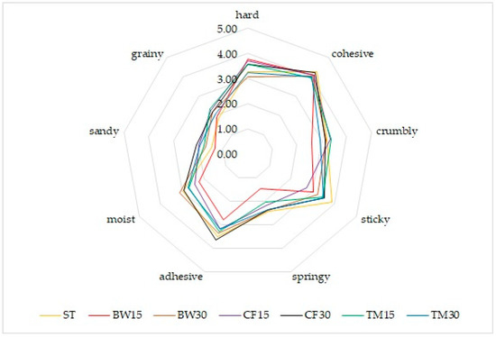 After assessing the acceptance of six samples against the control sample (Figure S2), it was found that the highest overall acceptance of the bars was demonstrated by samples without the addition of insect flour ST-6.48 (Table 5). However, bars with the addition of buffalo worm flour were rated only slightly lower, both in the case of 15% buffalo worm flour (BW15), with acceptance of 6.26, and 30% buffalo worm flour (BW30), with acceptance of 6.28 (Table 5). It seems that increasing the proportion of buffalo worm flour had no effect on the overall acceptance rating. The lowest overall acceptance score was obtained for bars with mealworm flour. Among the analyzed sensory features, the smallest differences in results were obtained for assessments of appearance and color. In fact, the appearance and color of bars with the addition of 30% buffalo worm flour and 30% cricket flour were rated the lowest, which, however, was not reflected in the overall acceptance rating, especially in the case of buffalo worm, where this variant was rated the highest (Table 5). The decisive descriptor determining final acceptance was likely the taste of the bars tested. Texture is also an important element of the sensory evaluation. In the context of texture, the form of the insect from which the flour is made, and its amount, are of key importance. The more insect flour added, the lower the texture score. Only with cricket flour was the variable addition of flour irrelevant. The structure of bars including cricket in their composition was rated the lowest. This is probably related to the fact that only in this one variant was the adult form, the imago, used. These samples contained more chitin, which is an important factor determining texture. This is important information for manufacturers designing novel functional food based on edible insects.