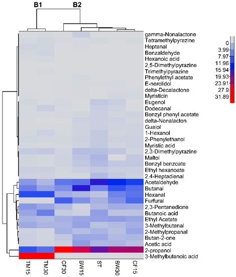 Results of the analysis of aroma compounds in the control and edible insect flour-substituted bars analyzed by an electronic nose are presented as a heatmap (Figure 4). A total of 38 volatile compounds were identified in the analyzed bars, including aldehydes, ketones, alcohols, esters, pyrazines, lactones, phenols, acids, and pyranones. The results showed that the control bars and those substituted with insect flours differed significantly in terms of the content of aroma compounds. An agglomerative hierarchical cluster analysis coupled to the heatmap was generated to depict the relationship between insect flour supplementation and the concentration of individual volatile compounds in bars (Figure 4). Euclidean distance was used as the distance measure for determining the similarity between samples, and the axis of the map showed the samples and volatile compounds. Different colors in the rectangles indicate the concentration of total amounts of different classes of aroma compounds found in the samples. The results showed that the profile of volatile compounds for the bars depends on the type and proportion of insect flours used. In the heat map, two main clusters in columns were generated and highlighted by hierarchical clustering (B1 and B2). The different clusters of bar samples indicate significant differences in aroma compound profiles. It can be observed that bars with mealworm flour can be grouped into the first cluster (B1), which obviously differed from the other samples. According to hierarchical cluster analysis in the heat map, the type and concentration of volatile compounds in the control bars show some similarity to the amounts of these compounds in the samples supplemented with buffalo worm and cricket flours, regardless of their percentage amount. Thus, these samples were grouped as the second cluster (B2). The individual flavor compounds were also grouped into two main clusters in the dendrogram and were further grouped into different subclusters according to the similarity of their concentration patterns in the analyzed bar samples. As can be seen in Figure 4, the most abundant flavor and aroma compounds in the control bars and those supplemented with buffalo worm and cricket flours were acetaldehyde and 2-propanol, which are responsible for pungent choking and sharp musty alcoholic odors, respectively [28]. Samples grouped in the second cluster also contain significantly higher amounts of furfural, acetaldehyde, 2-propanol, and 2-methylpropanal than those from the first cluster. Bars supplemented with mealworm flour, regardless of the percentage amount, were characterized by significantly higher 3-methylbutanoic acid, hexanal, and 2,3-pentanedione content than other bar samples. These compounds provide pungent, acid, cheese, sweet, creamy, and nutty odors.