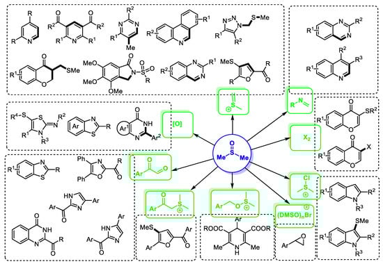 Dimethyl sulfoxide (DMSO) has long been used as a low-toxicity, inexpensive and easily accessible solvent [1]. Furthermore, dimethyl sulfoxide can also be applied as a versatile reagent for the construction of functionalized molecules. Several powerful DMSO-based transformations, such as Swern oxidation (ClCOCOCl/DMSO), Moffatt oxidation (DCC/HX/DMSO), Parikn–Doering oxidation (SO3/DMSO), Kornblum oxidation (RX/DMSO), Corey–Chaykovsky reaction (MeI/DMSO) and Pumerer rearrangement (Ac2O/sulfoxide), have been frequently utilized in organic synthesis [2,3,4,5,6,7]. Dimethyl sulfoxide is a valuable synthon for constructing heterocyclic compounds by acting as a carbon source, sulfur source and oxygen source as well as a key oxidant for various transformations. A large number of efficient methodologies have been developed in the past decades for constructing functionalized heterocycles, either by the direct synthesis manner or by the late-stage modification route.