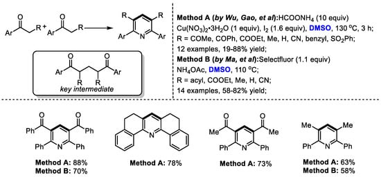 Interestingly, α-substituted aryl ketones would undergo a different reaction pathway under the same reaction system. Wu and Gao found that when submitting α-substituted aryl ketones to their HCOONH4/I2/Cu(NO3)2/DMSO reaction system, a series of functionalized pyridines were yielded by forming methylene-bridged 1,5-diketone as a key intermediate (Scheme 3). In contrast, differently from the reactions using methyl ketones, C–H moiety was introduced at the C4 position of the pyridine. Subsequently, the Ma group also synthesized polysubstituted pyridines using a selectfluor/DMSO reaction system [17]. Selectfluor was used as the activator of DMSO. DMSO served as the methine source for both processes.
