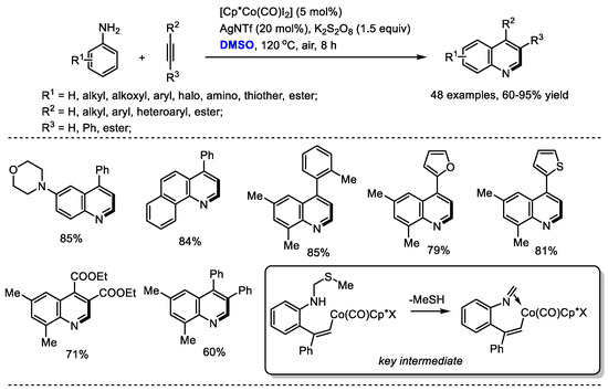 Substituted alkynes can be used instead of ketones as reaction partners to react with the in situ-generated imine for quinoline synthesis. Yi and Zhang reported a direct Co(III)-catalyzed assembly of quinoline with dimethyl sulfoxide, anilines and alkynes (48 examples, up to 95% yield). K2S2O8 was utilized as the activator of DMSO for generating methyl(methylene)sulfonium cation. A mechanistic study suggested that this transformation was initiated with C–H activation and 2-vinylbenzenamine species may be the active intermediate for this process. It is worthy of note that the reaction has several advantages including the utilization of simple and easily accessible materials, privileged framework-containing products, exclusive regioselectivity, good functional group tolerance and a wide substrate scope (Scheme 8) [22].