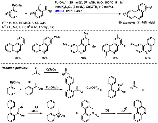 Phenanthridine can be found as a core substructure in a series of biologically active compounds including Trispheridine, Decarine, Norchelerythrine, Avicine, Nitidine and Fagaronine. Ma and coworkers developed a one-pot synthesis of phenanthridines with arylboronic acids and o-bromo arylamides through a Suzuki coupling/N-methylthiomethylenation/elimination/electrocyclization/aromatization cascade sequence (50 examples, 31–78% yield). Pd(OAc)2 was employed to catalyze the Suzuki reaction delivering biaryls. K2S2O8 was applied as the activator of DMSO to generate meth(methylene)sulfonium, which was used for the formation of a third cycle in the presence of a copper catalyst (Scheme 9) [23]. The electrocyclization of in situ-formed imine could be an efficient way of constructing fused rings.