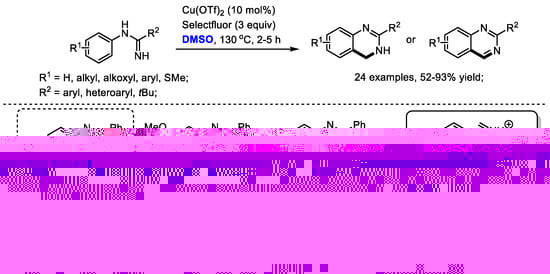 Quinazoline as a core-structure is widely distributed in natural products and synthetic bioactive compounds including protein tyrosine kinase inhibitors, anticancer agents, antiviral agents and antitubercular agents. In 2013, Zhang and Xiong disclosed an efficient copper-catalyzed synthesis of quinazolines with amidines and dimethyl sulfoxide (24 examples, 52–93% yields). Unfortunately, cyclic amidine substrates failed to yield corresponding quinazolines, demonstrating the limitation of this protocol.