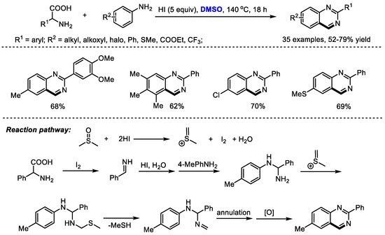 Amino acids as key building blocks have been widely used for preparing heterocyclic compounds through a variety of processes such as an Ugi reaction and a decarboxylation reaction. Wu and Wu synthesized substituted quinazolines with carboxylic acids, aromatic amines and dimethyl sulfoxide, through an HI-mediated amino acid catabolism/reconstruction together with the insertion/cyclization of DMSO (Scheme 12) [26]. In this process, amino acids were catabolized and served as a carbon and nitrogen source. Reconstruction with aromatic amines and subsequent insertion/cyclization with DMSO led to a large number of functionalized quinazolines (35 examples, 52–79% yield).