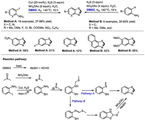 In the presence of a sulfur source, benzothiazole can be constructed efficiently under DMSO-involved protocols. Zhu, Liang and Yu achieved an efficient three-component synthesis of 2-unsubstituted benzothiazoles with o-iodoanilines, K2S and dimethyl sulfoxide (Method A). A series of o-iodoanilines bearing electron-donating or electron-withdrawing groups all can be compatible with this process, producing corresponding benzothiazoles in moderate to good yields (16 examples, 37–98% yield).