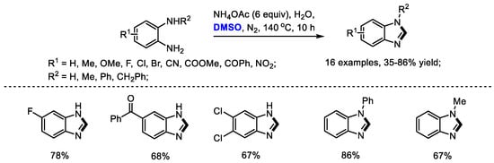 In addition, Zhu, Liang and Yu further extended their methination strategy to the preparation of benzimidazoles. A variety of 2-unsubstituted benzimidazoles were successfully constructed with o-phenylenediamines and dimethyl sulfoxide in the presence of ammonium acetate (16 examples, 35–86% yield). This process also featured good functional group compatibility and high efficiency (Scheme 15) [27].
