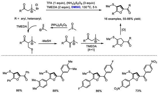 Versatile sulfur ylides are capable of participating in various cycloadditions for synthesizing carbo- and heterocycles. Shu and Wu established a facile synthesis of multisubstituted furans with stabilized sulfonium salts and dimethyl sulfoxide (Scheme 16) [29]. α-Methylene sulfonium salt was formed as the key intermediate, which would undergo a [4 + 1] annulation with the sulfur ylide to yield dihydrofuran. A variety of aryl groups can be tolerable in this process (16 examples, 55–88% yields). Unfortunately, alkyl groups failed to produce the desired furans.