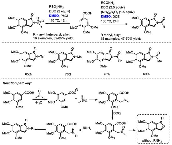 An active species, methyl(methylene)sulfonium, was proposed to be generated from DMSO in the presence of acid. A subsequent electrophilic addition of methyl(methylene)sulfonium with 3,4,5-trimethoxybenzoic acid gave a thioether which would be oxidized by DDQ immediately. A following nucleophilic substitution of the sulfoxide with amide and a final lactamization yielded the isoindolinone product. Alternatively, the C–S bond cleavage may be followed by the formation of a C–O bond in the absence of amide yielding lactone 4,5,6-trimethoxyisobenzofuran-1(3H)-one (Scheme 17) [30].