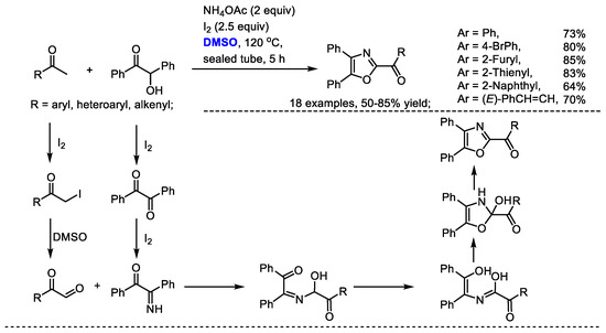Oxazole derivatives are biologically interesting compounds as well as being valuable building blocks. Wu and coworkers realized a convergent integration of two self-assembly domino sequences for synthesizing oxazole derivatives with methyl ketones, benzoins and ammonium acetate (Scheme 27) [40]. Aldehydes bearing aryl, heteroaryl and alkenyl groups can be compatible in this process (18 examples, 50–85% yield). This methodology features simple starting materials, mild conditions and easy operation. Arylglyoxal was obtained through the iodination of aryl methyl ketone and a following Kornblum oxidation in the presence of DMSO. Intramolecular proton-transfer of the adduct of 2-imino-1,2-diphenylethan-1-one with arylglyoxal and a final dehydration yielded the desired oxazole.