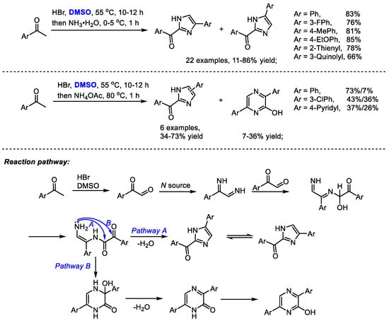 The Dai group established a one-pot synthesis of 2-aroyl-(4 or 5)-aryl-1H-imidazoles with aryl methyl ketones, hydrobromic acid, dimethyl sulfoxide and an ammonium source in 2014 (Scheme 28) [41]. A series of imidazoles were prepared efficiently (22 examples, 11–86% yield). The reaction was proposed to undergo a HBr/DMSO mediated α-bromination, Kornblum oxidation and Debus–Radziszewski imidazole synthesis. Interestingly, pyrazines can be obtained when switching to ammonium acetate as a nitrogen source. This process features easily available materials, mild reaction conditions and easy operation. DMSO served as the oxidant in the Kornblum oxidation.