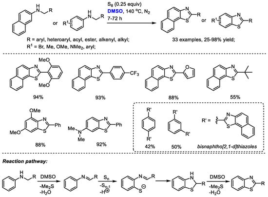 The DMSO-involved oxidative formation of imine and oxidative aromatization can be employed for heterocycle synthesis. Deng and Liang reported an efficient protocol for the facile synthesis of benzothiazoles and naphtho [2,1-d]yhiazoles with N-substituted arylamines and elemental sulfur (Scheme 30) [43]. Dimethyl sulfoxide was used as the oxidizing reagent for the oxidation of N-substituted arylamine into imine and the final oxidative aromatization as well as the solvent. The electrophilic addition of the in situ-generated imine with elemental sulfur (S8) was followed by an elimination of elemental sulfur (S7) and proton. A subsequent intramolecular cyclization yielded thiazoline intermediate and a DMSO-mediated oxidative aromatization delivered the desired product. This approach was capable of producing a broad range of highly functionalized benzothiazoles and naphtho [2,1-d]yhiazoles (33 examples, up to 98% yield).