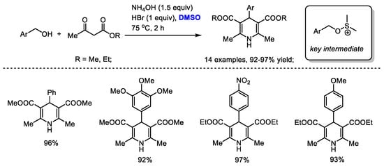 A facile synthesis of Hantzsch 1,4-dihydropyridines utilizing a HBr/DMSO reaction system was established by Ranjbar and coworker (Scheme 31) [44]. A variety of substituted benzyl alcohols could be compatible to produce 1,4-dihydropyridines in excellent yields (14 examples, 92–97% yield). A (benzyloxy)dimethylsulfonium was suggested as a key intermediate to undergo a nucleophilic substitution reaction with a 1,3-dicarbonyl derivative. The in situ-formed bromodimethylsulfonium bromide may also be responsible for the oxidative generation of a conjugated imine for further electrocyclization.