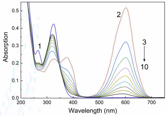 Absorption spectra of 22 in THF in spiropyran (1) and merocyanine forms (2–10) measured before (1) and upon UV irradiation (2) through a UFS-1 light filter and during bleaching in the dark (3–10). C = 10−4 M, L = 0.1 cm.