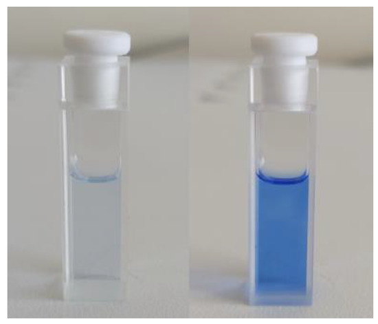 Figure 1 shows the absorption spectra typical of spiropyrans 22–26 without and under UV irradiation, taking compound 22 as an example. The measured spectra exhibit four most characteristic bands, three being in the UV range with peaks at 266–267, 324–327, and 374–377 nm, and one being in the visible range with a maximum at 599–604 nm (Figure 1 and see Supplementary Materials). The two first-mentioned bands are known to correspond to spiropyran molecules in the closed-ring form (Figure 1, curve 1), while the longer wavelength bands are attributable to absorption of molecules in the open merocyanine form (Figure 1, curve 2). The strong absorption of photochromic compounds 22–26 in the orange spectral range (599–604 nm) is responsible for the deep blue color of their solutions (Figure 2).