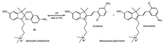 Spiropyrans form one of the most interesting classes of organic photochromic compounds capable of reversible isomerization under the action of external stimuli. The optical and other physicochemical properties of spiropyran isomers considerably differ; therefore, these photochromes can be used as sensors [1,2,3,4,5,6], optoelectronic and holographic devices [7,8], memory cells [9,10,11], etc. Moreover, an obvious advantage of spiropyrans over other classes of photochromic compounds is the relative ease of their synthesis and structural modification. Finally, modification of the spiropyran structure by introduction of functional groups offers broad opportunities for the targeted synthesis of new photochromes with a wide variation of the spectral and kinetic properties [12,13,14].