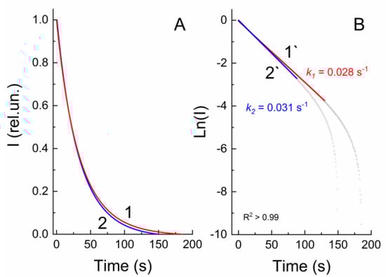 Study of the relaxation kinetics of compounds 22–26 without irradiation or on exposure to visible light showed that the kinetic curves are exponential (Figure 4A); their linearization in the ln(I)–t(s) coordinates gives linear plots for the initial stage (Figure 4B). This fact indicates that the reverse transition is a first-order reaction.