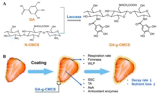 Figure 1. Mechanism of CMCS and GA grafting and working for strawberry preservation. (A) The mechanism of synthesis of GA-g-CMCS by laccase-catalyzed grafting reaction. (B) The schematic diagram of strawberry preservation treated with GA-g-CMCS coating. GA: gallic acid, N-CMCS: N-carboxymethyl chitosan, GA-g-CMCS: GA grafted onto N-CMCS, WLP: weight loss percentage, SSC: Soluble solids content, TA: titratable acidity, AsA: ascorbic acid.