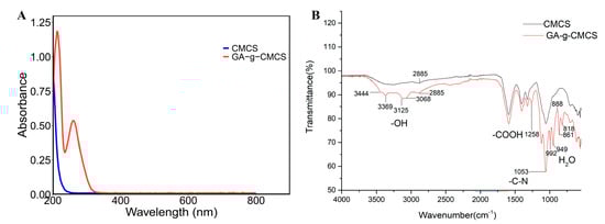 In order to further explore the grafting of GA and CMCS, the spectroscopic properties were determined. The ultraviolet-visible (UV-vis) spectra of CMCS and GA-g-CMCS are shown in Figure 2A. There was no absorption peak in the UV-vis spectrum of CMCS, which may be due to the lack of chromosphere. However, GA-g-CMCS displayed two distinct peaks at 213 nm and 260 nm. This result is consistent with that of GA grafted with O-CMCS [31]. This difference could be attributed to the introduction of the benzene ring of GA [32], confirming the successful reaction between GA and CMCS.