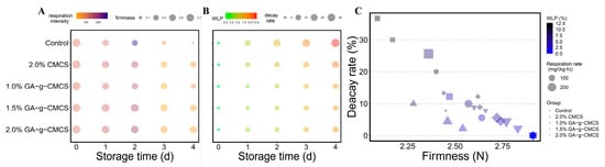 Figure 4. (A) Variation in respiration rate and firmness, (B) WLP and decay rate and (C) decay rate relative to firmness of strawberries at storage time of 0, 1, 2, 3 and 4 days.