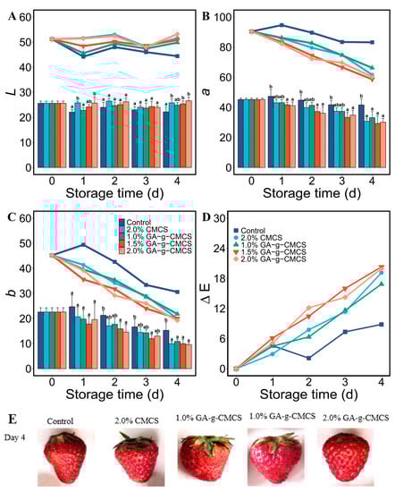 Figure 5. (A) Variation in luminance L; (B) color value of red–green axis a; (C) color value of blue-yellow axis b; and (D) color difference ΔE at storage time of 0, 1, 2, 3 and 4 days. (E) Photograph of strawberry coated with pure deionized water, CMCS and GA-g-CMCS, respectively.