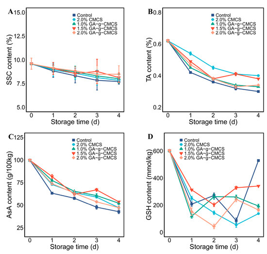Figure 6. (A) Variation in SSC; (B) TA; (C) AsA; and (D) GSH (of strawberries at storage time of 0, 1, 2, 3 and 4 days).