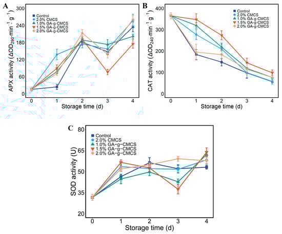 Figure 7. (A) Variation in CAT activity; (B) APX activity and (C) SOD activity of strawberries at storage time of 0, 1, 2, 3 and 4 days.