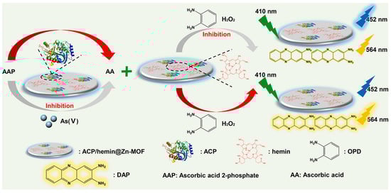 Ghosh et al. synthesized a new hydrolytically stable luminescent Zn2+ based cationic MOFs (iMOF-4C) []. iMOF-4C was constructed from a tripodal neutral N-donor linker 1,1′-(5′-(4-(1H-imidazol-1-yl) phenyl)-[1,1′:3′,1″-terphenyl]-4,4″-diyl)bis(1H-imidazole) and a d10 metal ion for the simultaneous detection and removal of environmentally toxic oxygen anions (CrO42−, Cr2O72−, HAsO42−, and HAsO32−) in aqueous media. The MOF based sensing probe showed accurate and sensitive recognition of these anions through its unique “on–off” fluorescent signal output and extremely fast response time. Xu et al. developed a ratiometric fluorescent biosensor based on acid phosphatase and hemin loaded multifunctional Zn-based MOF (ACP/hemin@Zn-MOF) for As5+ sensing []. As shown in Figure 5, the intrinsic fluorescence (452 nm) in ACP/hemin@Zn-MOF was derived from 2-aminoterephthalic acid ligand, and the hemin was characterized by peroxidase activity. ACP/hemin@Zn-MOF could catalyze the oxidation of o-phenylenediamine (OPD) to produce 2, 3-diaminophenazine (DAP) with a fluorescence signal at 564 nm and weaken the fluorescence intensity of ACP/hemin@Zn-MOF (452 nm). When present in the sample, ascorbic acid 2-phosphate (AAP) could be hydrolyzed by ACP to form ascorbic acid (AA), which hindered the oxidation of OPD and thus affected the fluorescence intensity at 564 nm. Furthermore, the addition of As5+ could irreversibly poison ACP to prevent hydrolysis of AAP, resulting in the recovery of the fluorescence signal at 564 nm and the suppression of the signal at 452 nm again. The LOD of ACP/hemin@Zn-MOF for As5+ was 1.05 μg/L. Based on the optimization of organic ligands, a novel Eu-MOF with the capability of AsO43− emission sensing and trapping was constructed by the solvothermal method []. The Eu-MOF nanostructures with dispersion characteristics clearly showed a “turn-on” fluorescence emission characteristic with obvious intensity contrast in the arsenate sample, which reduced the LOD to 17.8 nM for arsenate species in the aqueous environment. Subramanian et al. reported an MOF-derived magnetic porous carbon (MPC) composite []. FAM labeled ssDNA was adsorbed on the surface of MPC composites and fixed by π-π stacking interaction, which resulted in the quenching of fluorescence intensity. When As(V) was added to the probe system, the strong binding of As(V) to MPC resulted in the spontaneous displacement of FAM-labeled ssDNA from the MPC material, and thus the fluorescence intensity was restored. Based on this principle, the fabricated sensor exhibited a highly sensitive fluorescence response to As5+ in the range of 0–15 nM, with an LOD as low as 630 pM.