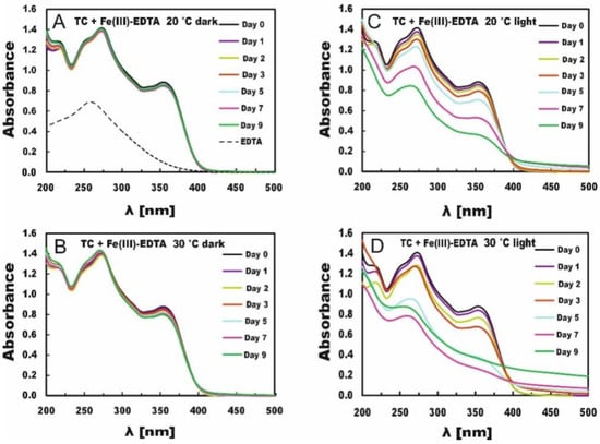 The changes in the absorption spectra of the TC solutions with Fe(III)-EDTA stored in the dark at both 20 °C and 30 °C were negligible (Figure 1A,B), which indicates that Fe (III) was released very slowly from this compound in the dark, especially at 20 °C. On day 9 of measurements at temperature 20 °C, the absorbance at the maximum (λ = 353 nm) absorption band dropped from A = 0.884 only to A = 0.854, whereas at 30 °C, it dropped to A = 0.800. That is, increasing the temperature resulted only in a slightly faster release of iron needed for the degradation of tetracycline. The action of light, however, accelerated the process of iron release and resulted in larger changes in the absorption spectra.