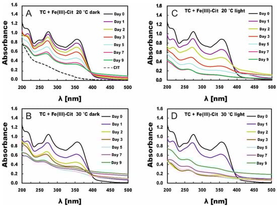 TC degradation in the presence of Fe(III)-Cit proceeded much faster (Figure 2), and profound changes were observed in absorption spectra even in the dark (compare with Figure 1). The absorption spectra of TC solutions with Fe(III)-Cit, including even those stored in the dark, displayed significant changes within 9 days. The absorption spectra of the solutions stored at 30 °C for just 5 days did not resemble the TC absorption spectra of fresh TC solutions. In turn, the TC absorption spectra of the light-exposed samples were deformed as early as after 3 days, which pointed to almost complete TC degradation. The temperature also strongly affected TC degradation in this case, i.e., TC concentration decreased by 66% on day 9 in the samples stored at 20 °C in the dark, whereas in those stored at 30 °C, it decreased by 75% as soon as after 5 days. The degradation process was more drastic under light conditions, reaching 79% in the samples stored at 20 °C (on day 5) and 86% in those stored at 30 °C (day 3) (Table 2). It should be emphasized that the release of Fe from Fe (III)-Cit occurs not only in the light but also in the dark.