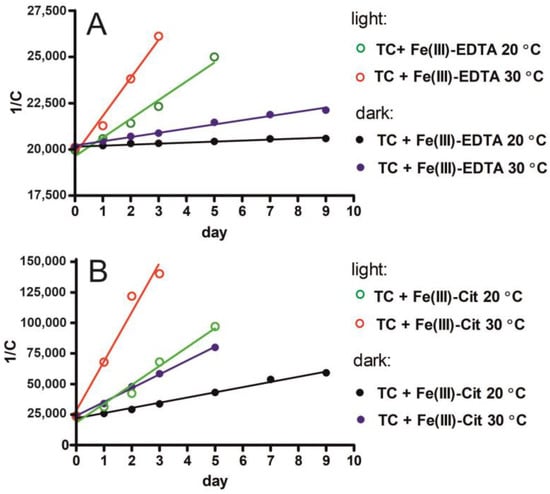 Calculations were made with the concentrations provided in Table 1 and Table 2. Figure 4 presents the dependency for TC solutions with Fe(III)-EDTA and Fe(III)-Cit under four variants of experimental conditions: 20 °C, 30 °C, dark, and light.