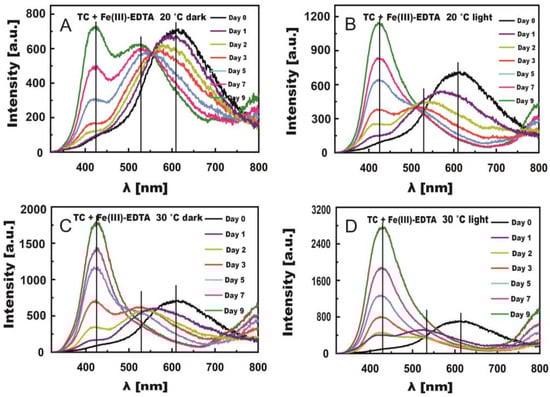 Figure 5A–D present changes in the fluorescence spectra of TC solutions with Fe(III)-EDTA. Negligible changes could be observed in the spectra of the samples stored in the dark at both 20 °C and 30 °C, which fully confirms results obtained from absorption spectra. The irradiation of solutions caused new fluorescence bands to appear. For samples stored at 20 °C, the band at the max. wavelength of ca. 610 nm practically did not shift within the first 2 days (Figure 5B). A noticeable decrease in fluorescence intensity and band shift toward the shorter waves were observed already on day three. On day 7, the shift approximated 70 nm to λ = 550 nm, and on day 9 it reached 90 nm to λ = 530 nm. In addition, a new band appeared with the maximum at λ = 430 nm, which at 30 °C could be noticed as early as on day 5 and then became the major band on day 9. A new band also appeared above the wavelength of 800 nm, which was clearly noticeable on days 7 and 9 at 30 °C. Its presence was ascribed to the fluorescence of C-T complexes of TC with Fe(III)-Cit, which was signalled by Smyk et al. [36]. These complexes should form as the result of electron transfer from the benzene ring onto the quinone ring [48]. However, their formation requires the presence of a stacking complex formed by a nonoxidized and an oxidized molecule of TC. The presence of this complex is highly likely because the binding of the first Fe(III) ion is followed by TC oxidation and Fe(III) reduction to Fe(II) [36].