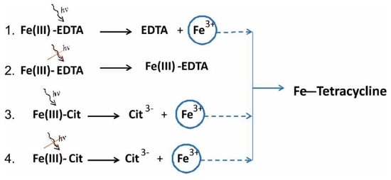 Therefore, both methods showed a significantly higher stability of EDTA-iron(III) complex than Cit-iron(III), with similar free energy difference. The obtained results explain why Fe ions from Fe(III)-EDTA molecules were released very poorly and did not degrade TC in the dark (Figure 11). Our absorption analysis results showed that only upon the activation of Fe(III)-EDTA by light did the complex release Fe ions that attached to TC and degraded it.