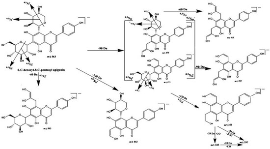 Proposed fragmentation pattern of 6-C-hexosyl-8-C-pentosyl apigenin in negative ion mode.