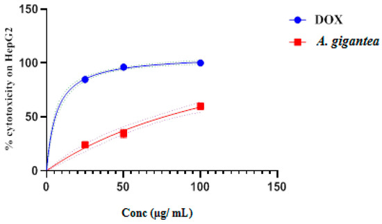 The Department of Cell Culture (Vacsera, Egypt) provided the HepG2cell line. The cells were cultured in a PYR-free 1640 RPMI medium (Thermo Fisher Scientific). The medium was made up of 10% FBS, 1% HEPES, and 1% antibiotic/antimycotic combination (LONZA). Different quantities (500, 250, and 125 g/mL) of the A. gigantea extract and doxorubicin (DOX) (as a standard drug) were applied following attachment of the cells (7000 cells/well) on 96 tissue culture plates. The plates were then incubated at 37 °C in 5% CO2 for 24 h. Cell viability was detected using a crystal violet assay following the general procedure previously described [19].