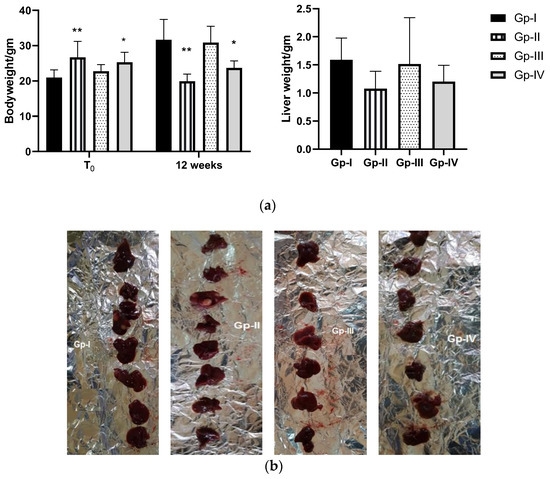 (a) Effect of A. gigantea leaf defatted methanolic extract on body weight (at initial time and 12 weeks) and liver weight (at 12 weeks) of different mouse groups. Gp-I: Group I, normal group; Gp-II: Group II, treated with DEN; Gp-III: Group III, treated with A. gigantea; Gp-IV: Group IV, treated with DEN combined with plant extract. Data represent the mean ± SEM. * p < 0.05, ** p < 0.01 indicate significant differences compared to Gp-I. (b) This photo represents liver mass between different groups.