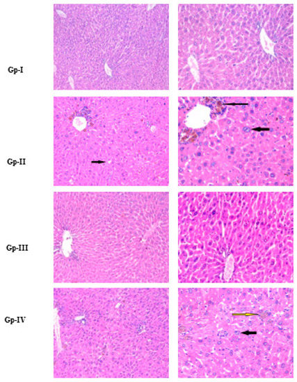 Histopathology using hematoxylin and eosin (H&E) staining of the liver, isolated from each animal group used in this study. For each group, the photo on the right side is a zoom-in taken from the photo on the left. Gp-I: Group I, normal group; Gp-II: Group II, treated with diethylnitrosamine; Gp-III: Group III, treated with A. gigantea; Gp-IV: Group IV, treated with diethylnitrosamine combined with plant extract. Thick and thin black arrows in Gp-II indicate HCC with focal acinar formation and bizarre-shaped hyperchromatic nuclei and focal cholestasis, respectively. Thin yellow and black arrows in Gp-IV indicate focal hepatocellular dysplasia with focal cholestasis and few apoptotic figures, respectively.