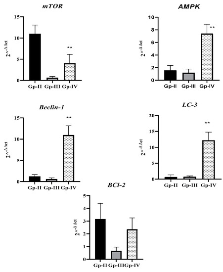 Relative quantification (RQ = 2^−ΔΔct) of tumor marker BCl-2 and autophagy markers (mTOR, AMPK, Beclin-1, and LC-3) in different animal groups, in relation to Gp-II (DEN group). Gp-II: Group II, treated with diethylnitrosamine; Gp-III: Group III, treated with A. gigantea; Gp-IV: Group IV, treated with diethylnitrosamine combined with plant extract. Data represent the mean ± SEM. ** p < 0.01 indicates significant differences from the DEN group.