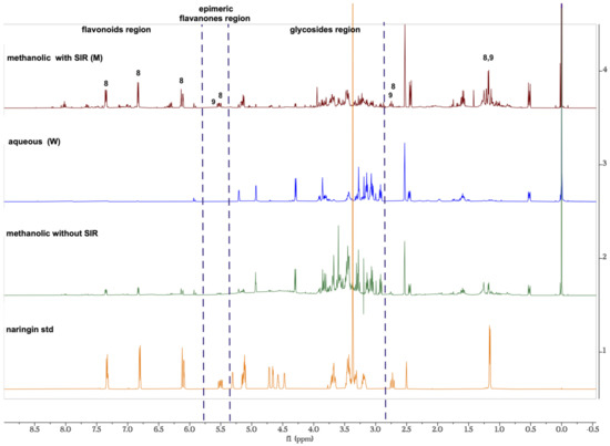 Figure 1 shows three main regions: aromatics, glycoside, and flavanones epimeric regions. Signals from 6 to 8.5 ppm correspond to aromatic protons systems characteristic of flavonoids. The intensity of these signals significantly increased after SIR treatment for methanol extracts; whereas intensity of this signal decreased in water extracts due to the increased signal in the sugar regions from 3.8 to 4.3 ppm. Relation to the anomeric region, around 5 ppm, these signals increased in water fractions and decreased in methanol fractions for both protocols. The epimeric region around 5.5 ppm attributable to the proton at C-2 which is characteristic of flavanones such as naringin and poncirin these are visible after SIR treatment for the methanolic fraction. It is noteworthy that the signals corresponding to anomeric sugars regions showed a low intensity in methanolic fractions M1 and M2, compared to the methanolic extract without SIR treatment.