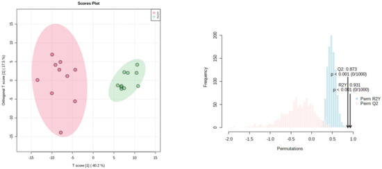 We analyzed twenty samples from different recollection sites were selecting randomly from among all the methanolic and water fractions of both protocols. Ten samples of the water and ten of the methanolic fractions were taken from the SIR procedure. PCA was applied to whole signals from the 1H NMR spectra, showing clear discrimination between both fractions. Data variances were explained with the cumulative percentage of the two first components (PC1 75.6% and PC2 13.7%, Supplementary Material Section). Those results showed selectivity in the resin impregnation to flavonoids, for instance naringin, over other components. As shown in Figure 2, the OPLS-DA showed a clear separation of samples of water and methanol fractions. These results were confirmed by 1H NMR spectral, which showed that both groups have a clear differentiation due to their whole NMR signals. Furthermore, the protocol is highly reproducible independently of the Grapefruit sources, it had values of Q2 0.873, which makes it a good predictive model for samples not included in it and a value of R2Y of 0.931, which allows for a good model adjustment.