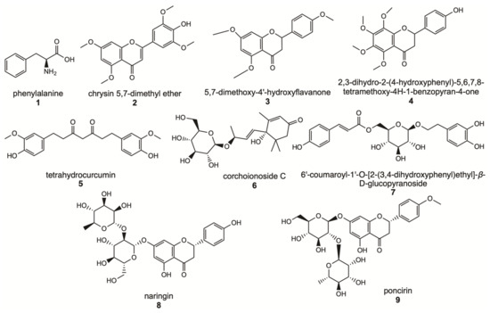 - Cassani, J.; Escalona Araujo, A.G.; Martínez-Vázquez, M.; Manjarrez, N.; Moreno, J.; Estrada-Reyes, R. Anxiolytic-like and antinociceptive effects of 2(S)-neoponcirin in mice. Molecules 2013, 18, 7584–7599. [Google Scholar] [CrossRef]