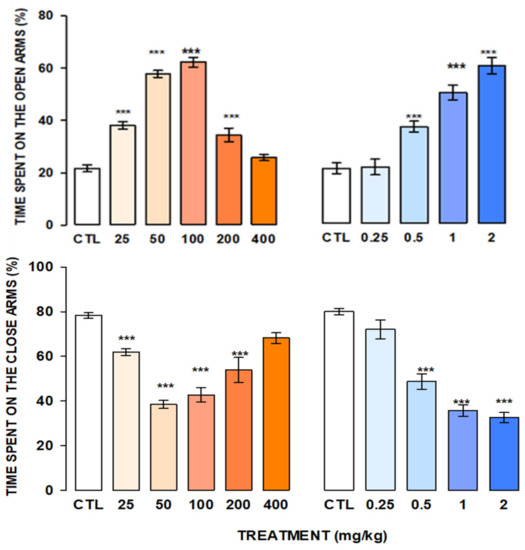 Anxiolytic-like effect of M1 at 25, 50, 100, 200, and 400 mg/kg (orange bars) and Diazepam at 0.25, 0.5, 1.0, and 2.0 mg/kg (blue bars) in the elevated plus maze test. Bars represent the mean ± standard error of the mean in groups of eight mice each. Data were analyzed by One Way ANOVA on Rank of Kruskal Wallis, followed by Mann-Whitney multiple comparison post-test vs. control group (CTL; white bars), *** p = 0.001.