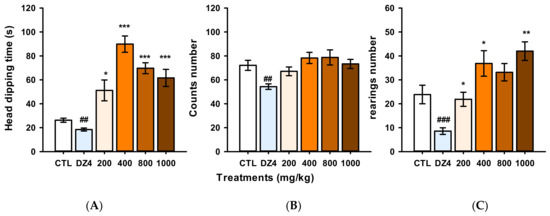 The hole-board apparatus is an acrylic box of 60 × 30 15 cm, with four equidistant holes (2 cm diameter) on the floor. Mice were placed at the center of the hole board, and the number of head-dips into the holes and the number of rearings (when the mouse stands up on its hind legs) were evaluated over a 5 min period. The animals were evaluated between 9:00 and 14:00 in a room lit by dim red light. Mice were administered with either DZ or the naringin-extract at 200, 4000, 800, and 1000 mg/kg 30 min before the test. In this paradigm, a decrease in head dipping number, the time of head dipping, and the number of rearings relative to the control group revealed a sedative action. At the same time, an increase in these variables is considered to have an anxiolytic-like effect [32].