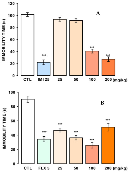 The antidepressant-like effects were evaluated in two behavioral models, namely, the tail suspension (TST) and the forced swimming (FST) tests. In both, the passive behavior of immobility is induced. However, the TST is more sensitive to a wide range of antidepressants independently of their action mechanism.