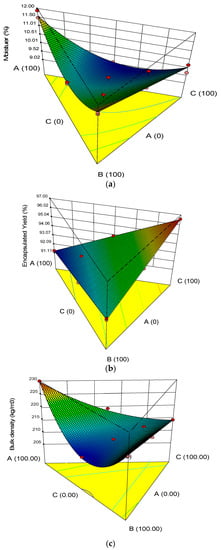 Mean values for the responses (moisture, encapsulation yield, bulk density, particle size, glass transition temperature) were calculated, and the corresponding results are shown in Table 2. The experimental results obtained for all studied parameters were statistically analyzed by fitting the data to the various models, and the evaluated regression models were recorded (Table 3). The model with a maximum R2 and p value less than 0.05 were selected. Three-dimensional surface plots indicating the influence of the wall materials on the exclusive responses are illustrated in Figure 1a–c. All models were statistically significant (p < 0.05), showing a good relationship between the responses and the ingredients (factors) at the 95.0% confidence level (Table 3). R2 values of the established models were higher than 0.93, illustrating that they were relatively adequate for the prediction aim.