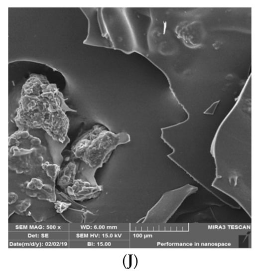 As can be seen in scanning electron microscope images (Figure 2), there was no definite geometric form for different types of prepared microcapsules. This could be due to the combination of pressure and temperature during the freeze-drying process. Ice crystals can be sublimated immediately without changing phase, resulting in solids that are sponge-like, brittle, and flaky. Solids are detected in coated and laminated forms when ice is sublimated. Furthermore, Fernandes et al. (2012) [6] stated that the smooth, with dents and slight agglomeration, surfaces of the powders are characteristic of encapsulated phytochemicals and indicate the encapsulating agent’s suitability.